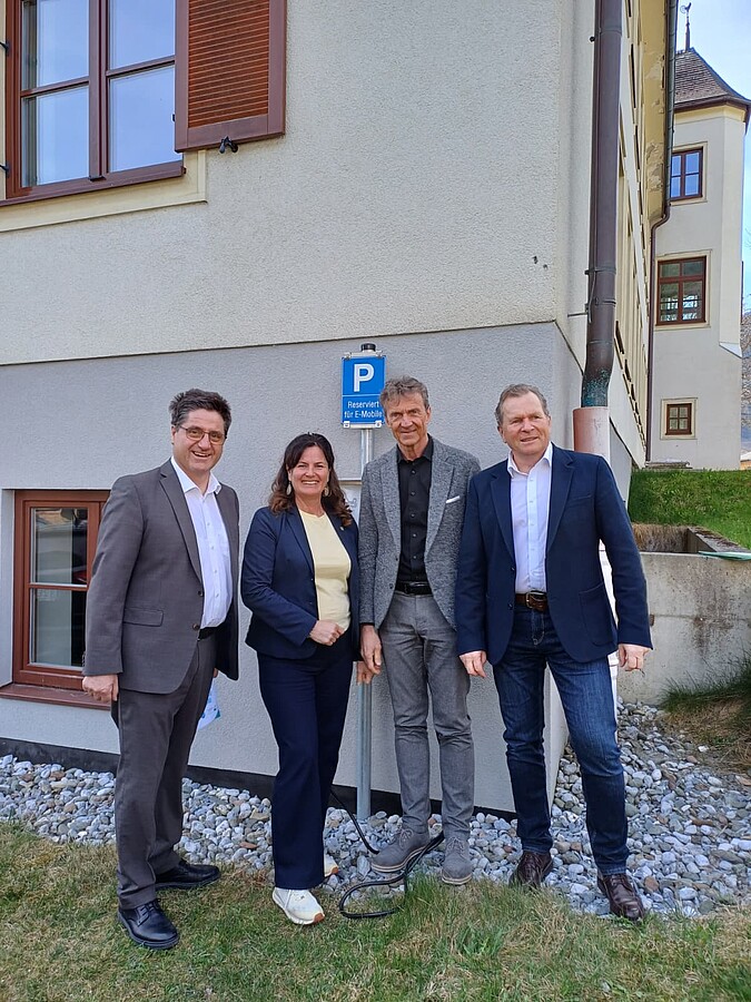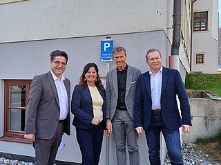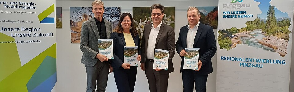 Foto: Vorstellung des Energieleitbildes Pinzgau 2040 bei der Pressekonferenz in der Gemeinde Bruck am 9.4.26: v.l. n.r. Günther Brennsteiner (Gemeinde Niedernsill), Barbara Huber (Gemeine Bruck a. d. Großgl.Str.), Michael Obermoser (Gemeinde Wald i. P.) und Erich Rohrmoser (Stadtgemeinde Saalfelden)
