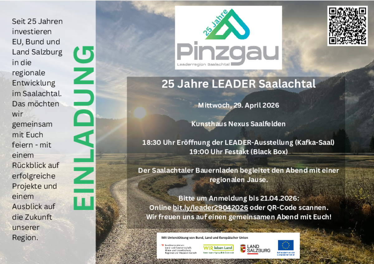 Seit 25 Jahren investieren EU, Bund und Land Salzburg in die regionale Entwicklung im Saalachtal. Das möchten wir gemeinsam mit Euch feiern - mit einem Rückblick auf erfolgreiche Projekte und einem Ausblick auf die Zukunft unserer Region.